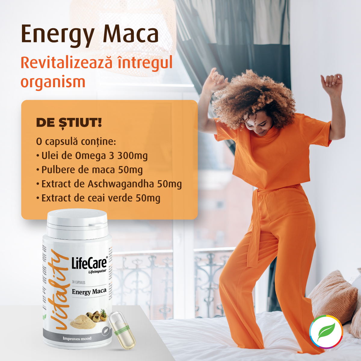 Energy Maca, cu Aschwagandha si Omega 3, Life Care® are actiune energizanta asupra mintii si organismului. Contribuie la revitalizarea intregului organism si ofera o stare de bine si echilibru interior.