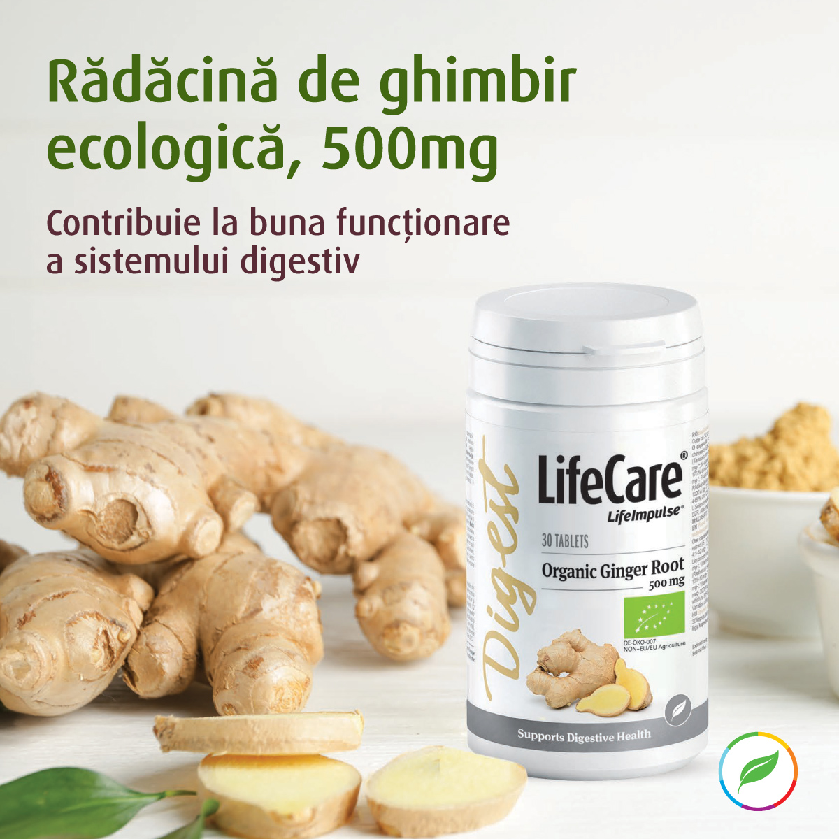 Radacina de Ghimbir Ecologica, 500mg, Life Care® contribuie la buna functionare a sistemului digestiv si ofera o stare de bine organismului. Poate diminua starile de greata, disconfortul abdominal, starile de epuizare si rau general. Reduce disconfortul asociat raului de miscare.