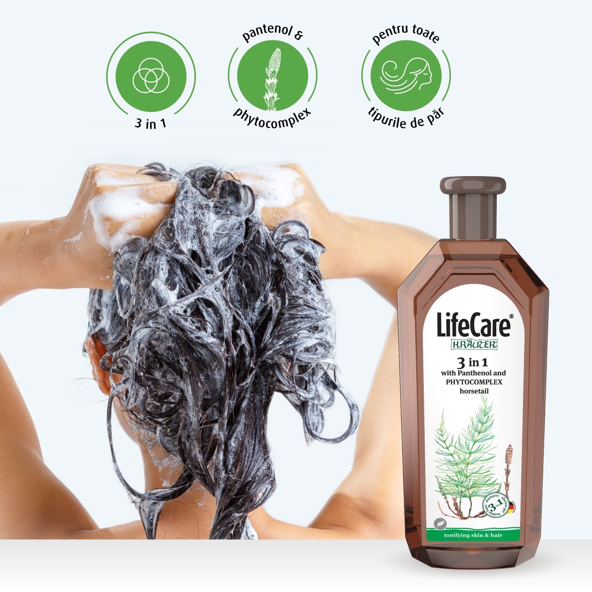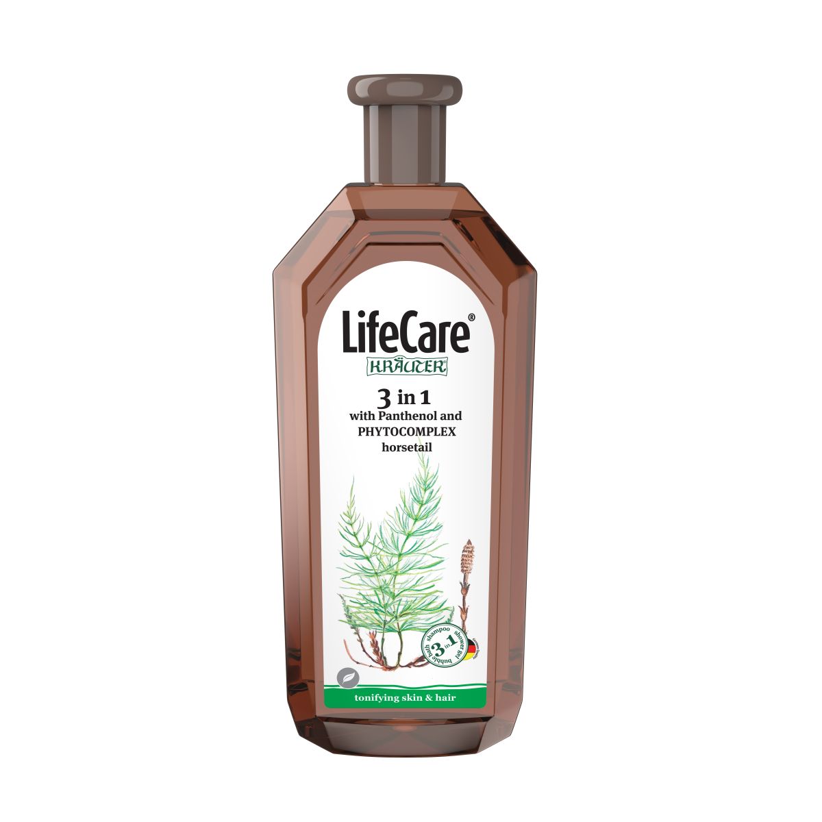 Sampon, gel de dus si spumant de baie 3 in 1, cu pantenol si PHYTOCOMPLEX coada calului, Life Care® impiedica imbatranirea prematura a pielii si este un bun remediu pentru parul fragil, intareste firele de par, combate ruperea firelor si despicarea acestora la varfuri.