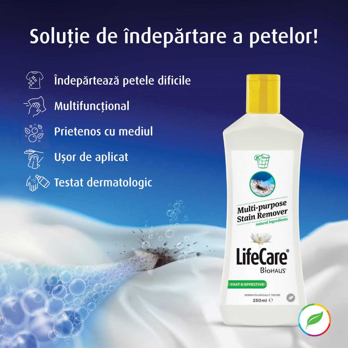 Solutia de indepartare a petelor multifunctionala, Life Care® este un produs special conceput pentru a indeparta eficient petele de pe diverse materiale si suprafete. Pe baza de ingrediente naturale, provenite din enzime naturale din bila bovina.