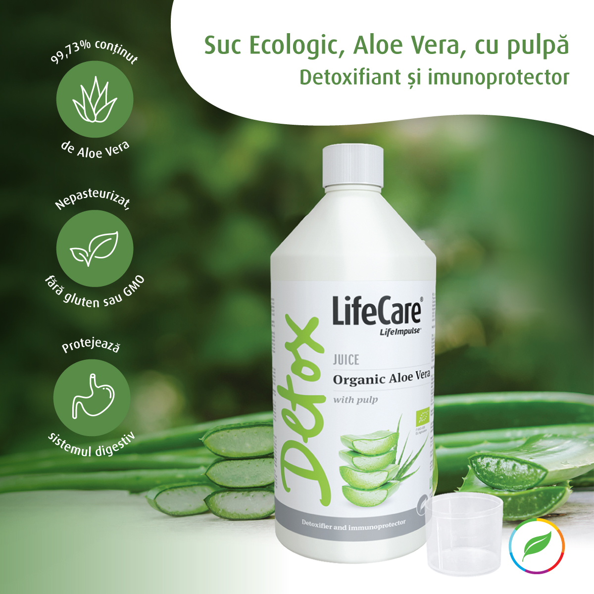 Suplimentul detoxifiant, din suc ecologic de Aloe Vera cu pulpa, Life Care® are urmatoarele beneficii:
