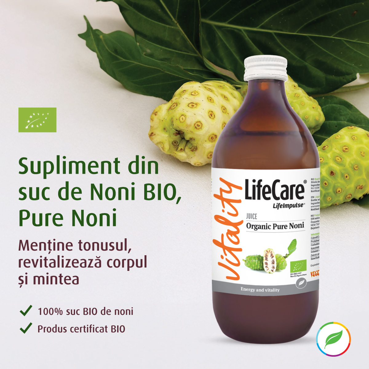 Suplimentul din suc de Noni BIO, Pure Noni, Life Care® contine 100% suc din fruct de Noni provenit din Polinezia Franceza, bogat in antioxidanti, vitamine si minerale.