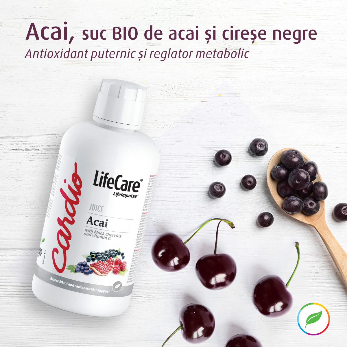 Suplimentul lichid antioxidant, din suc BIO de Acai si cirese negre, Life Care® este un supliment alimentar cu un complex nutritiv ideal de minerale, vitamine, antioxidanti, fitonutrienti si bioflavonoide, ce pot ajuta la echilibrarea metabolismului, la intarirea sistemului imunitar si la reglarea sistemului cardiovascular.